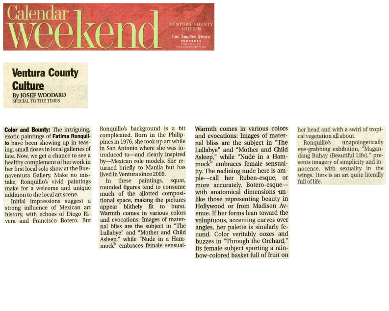 Initial impressions suggest a strong influence of Mexican art history, with echoes of Diego Rivera and [Fernando] Botero. But Ronquillo’s background is a bit complicated. Born in the Philippines in 1976, she took up art while in San Antonio where she was introduced to—and clearly inspired by—Mexican role models. She returned briefly to Manila but has lived in Ventura since 2000.