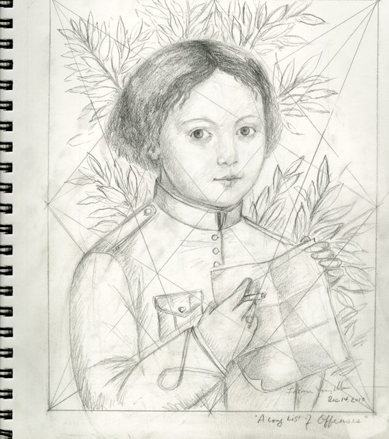Rubens closely guarded his drawings as studio secrets and never showed them to the public. He thought they revealed too much of his labor. My own drawings often show a multitude of offenses and corrections… all of which are a visual record of how I think and compose. Drawings expose the evolution of one’s thoughts. Here is the compositional drawing for “A Long List of Offenses”