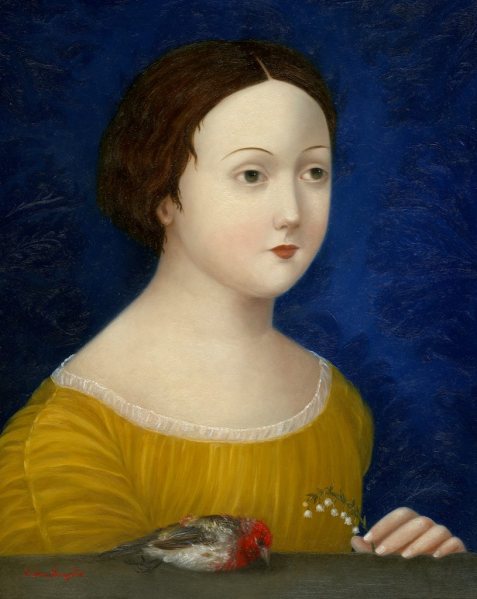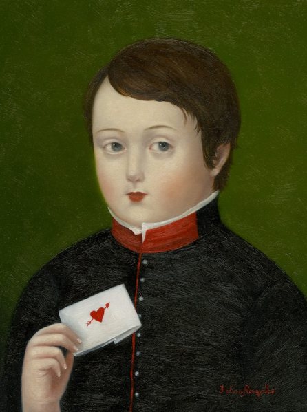 The smallest of the paintings, Valentine (all works 2011), is 8-by-6 inches and would fit comfortably in your hand. The format builds on both the miniature portrait painting and the photographic carte-de-visite. A boy in a high collared jacket holds a folded billet doux, decorated with a red heart. Whether he is the sender, the recipient or an Eros dressed as a Mozartian page remains a puzzle, but the image is charming. The implications of the document in A Long List of Offenses are more troublesome, yet the child who holds the accusatory paper seems stoic. The crisp white of the list is pleasing against his bright red military-style jacket with blue piping and collar. Ronquillo’s images of children avoid sentimentality, both because she presents them in quasi-adult costumes and because she captures an aura of solemnity that reminds us how seriously children regard the daily slights of life. Goya’s portraits of slightly stiff yet poignant miniature adults come to mind. While there is a doll-like quality to Ronquillo’s subjects, their demeanor is restrained, melancholy. Their faces seem haunted by emotions past, rather than blank. A good example is Recuerdo (10-by-8 inches), in which a young woman holds a spray of lily of the valley in her slender fingers. A red-headed bird lies on the ledge in front of her, and an aura of regret prevails. The artist’s rich color palette—especially in the golden yellow of the girl’s dress and the embossed deep-blue-on-blue backdrop—works in robust tension with the wistfulness of the girl’s mood.