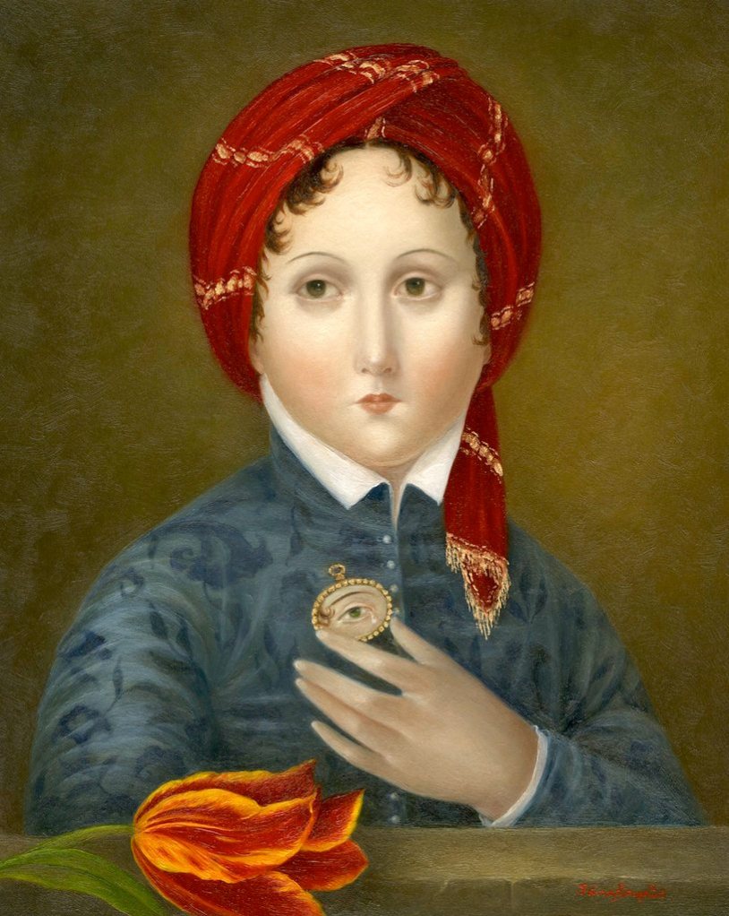 Opening her third solo show with Wally Workman Gallery, Fatima Ronquillo’s most recent intimate oil paintings delve into the mysterious and alluring world of the Lover’s Eye. Originating in the 1700’s, Lover’s Eyes were Georgian miniatures depicting the eye of a loved one. These were usually commissioned watercolors on ivory with richly decorated frames and worn as jewelry. Ronquillo’s use of Lover’s Eyes in her already complex narrative paintings prompts us not only to wonder about the character depicted, but also of the character that is merely hinted at. What is the nature of their relationship? Is the eye representative of a forbidden love, a child lost, a spouse? Ronquillo continues, year after year, to further fascinate us with windows into mysterious worlds and to urge our imagination to take hold. —Wally Workman Gallery