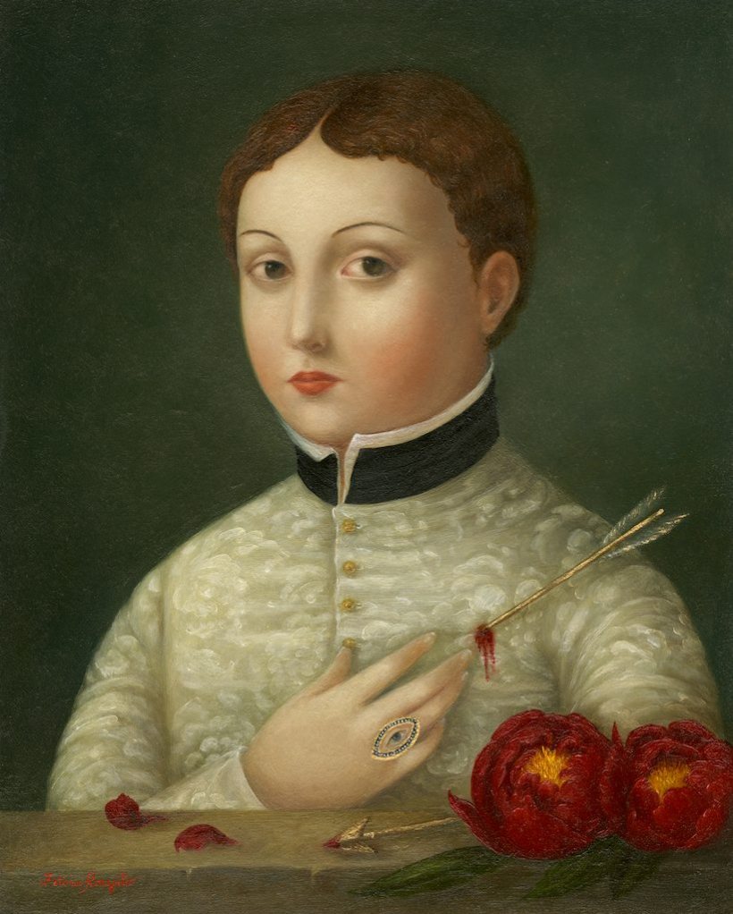 Compositionally speaking, the framed ornamental eye gives context and a reason for a floating third or fourth eye in a painting. It’s a device of conceit: a portrait within a portrait. For me, it’s an iconic symbol about the figure represented not unlike the reliquaries of saints in old devotional images. In this new series of works, the lover’s eyes are held by uniformed or exotically dressed figures that may have been away at war or estranged in some foreign land. Romance runs the gamut of emotions which can be symbolized by the language of flowers and even physically visible wounds.