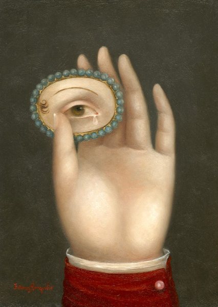 I came upon eye miniatures on the Ornamentalist blog a few years ago quite by accident. I’ve always been interested in miniature portraits and mementos so the imagery stuck. The miniature portrait started showing up in my works in 2008 with “The Miniature” and an actual lover’s eye last year with “Soldier with Lover’s Eye.”