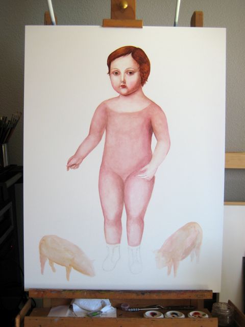 I start painting in the watercolor areas. Palette: Daniel Smith Rhodonite Genuine, Ultramarine Blue, Quinacridone Orange. I’m also using Natural Pigments’ French Raw Umber. The trick to painting on aquabord is being careful not to lift off the underlayers. A delicate touch is needed.