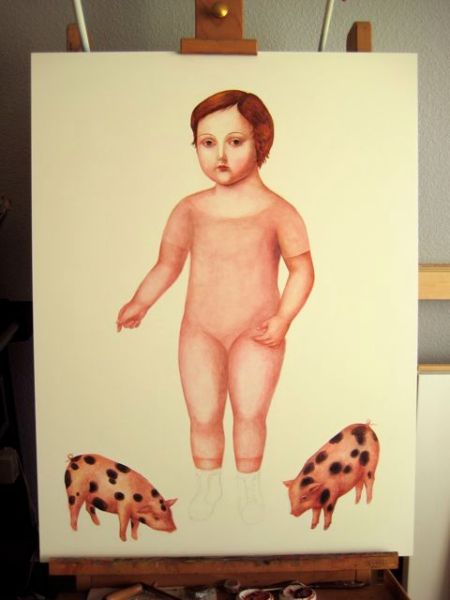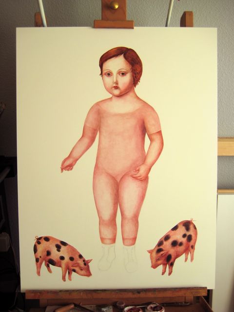 The watercolor areas are completed. Because I will be overpainting the flesh with the diaphanous dress, I spray on Krylon workable fixative.