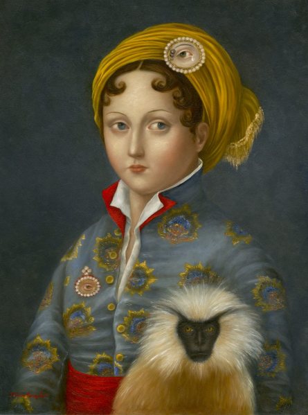 The dress of her characters also points toward estrangement and danger. Many of the eyes are held by uniformed or exotically dressed figures accompanied by wild animals staring out of the frame. Arrows pierce the skin near the keepsakes, externalizing the pain of a lost or ruined love. In “The Inconstant,” the pain depicted is not that of the main character but of a lover. High atop her head, affixed to a gold turban, a single tear falls from a green eye toward its pearl frame. The eye of another lover is pinned close to her heart. A langur sits almost menacingly in her lap. These signs of infidelity and faithlessness betray the subject’s round, innocent face. More subtly, in “The Treasured,” a young uniformed boy sits with one finger covering a Lovers’ Eye brooch. A shell, fire- red coral and a strand of pearls balance precariously nearby. His eyes are shy and his mouth is tight with reluctance. His cheeks are red with embarrassment. We can only suspect that this young voyager has been asked to share his love story. He is not willing. Perhaps he believes his heart is as unstable as the still life on the ledge and, strangely enough, we are satisfied with the mystery of his reluctance.