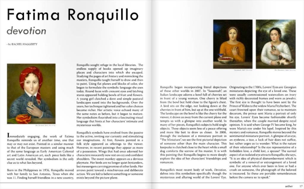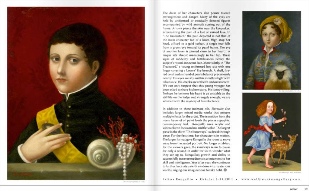 In addition to these intimate oils, Devotion also includes larger mixed media works that present multiple firsts for the artist. The transition from the many layers of oil paint lends the pieces a graphic, contemporary feel. Ronquillo uses acrylic and watercolor to focus on line and flat color. The largest pieceintheshow,“TheRunaways,”isabreakthrough piece. For the first time, her character is in motion. The larger format gave Ronquillo the room to move away from the seated portrait. No longer a tableau for the viewers gaze, the runaways seem to pause for only a second in order for us to wonder what they are up to. Ronquillo’s growth and ability to successfully traverse mediums is a testament to her skill and intelligence. Year after year, she continues to further fascinate us with windows into mysterious worlds, urging our imaginations to take hold.
