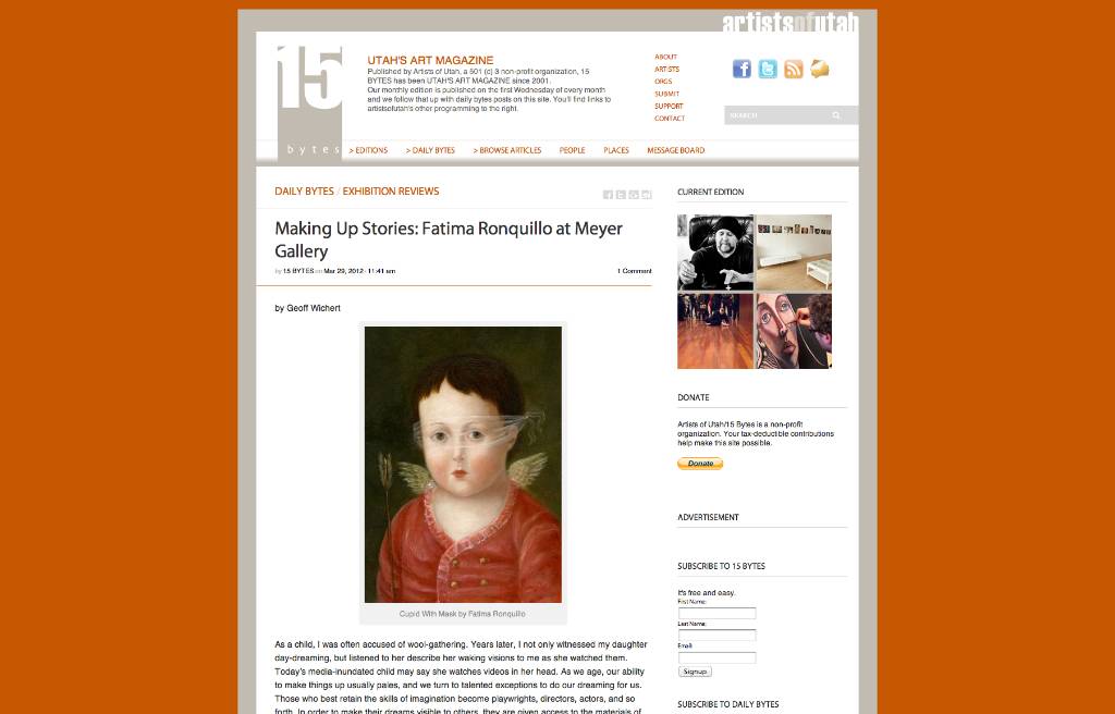 Rarely is the connection between everyday imagining and art making so clearly demonstrated as in the paintings of Fatima Ronquillo. This probably has to do with her having been an adolescent when her family left the Philippines, where she was born, and brought her to the United States. A child uprooted at this emotionally critical age may become the kind of artist who creates a whole world for herself. Artistically, Fatima is the affectionate descendent of the great Fernando Botero, whose ‘volumetric’ figures achieve thereby a surprisingly universal character, against which his meticulously rendered, meaningful details create vivid social commentary. Another relative, perhaps a distant cousin, is Utah’s Brian Kershisnik. Both revel in projecting the inner life of their ‘characters’ onto a theatrical stage. Kershisnik imagines the life of the spirit, set in the home or in heaven; Fatima imagines a romance, replete with traditional symbols: arrows, bleeding wounds, hand-written notes, and in two recent series, ornaments depicting the Eye of the Beloved and, conversely, blindfolds.