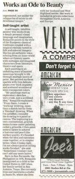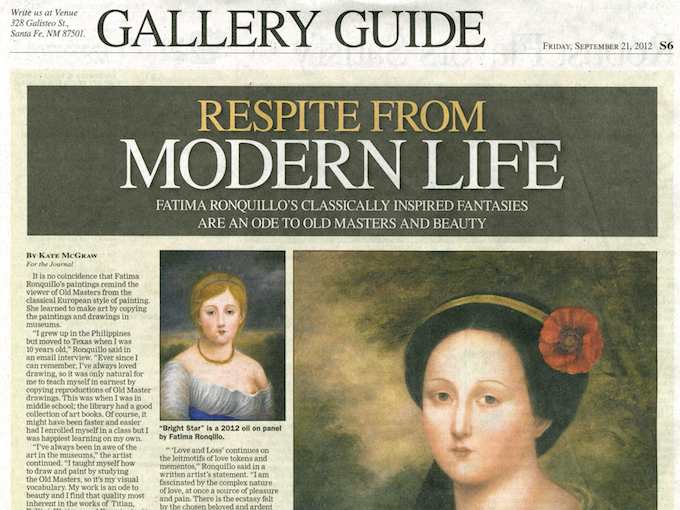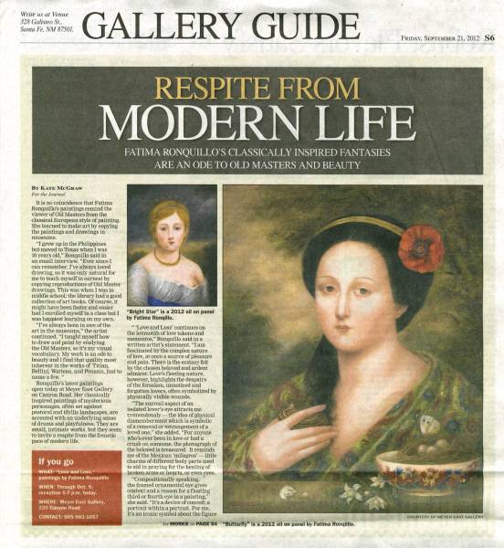 Ronquillo’s latest paintings open today at Meyer East Gallery on Canyon Road. Her classically inspired paintings of mysterious personages, often set against pastoral and idyllic landscapes, are accented with an underlying sense of drama and playfulness. They are small, intimate works, but they seem to invite a respite from the frenetic pace of modern life.
