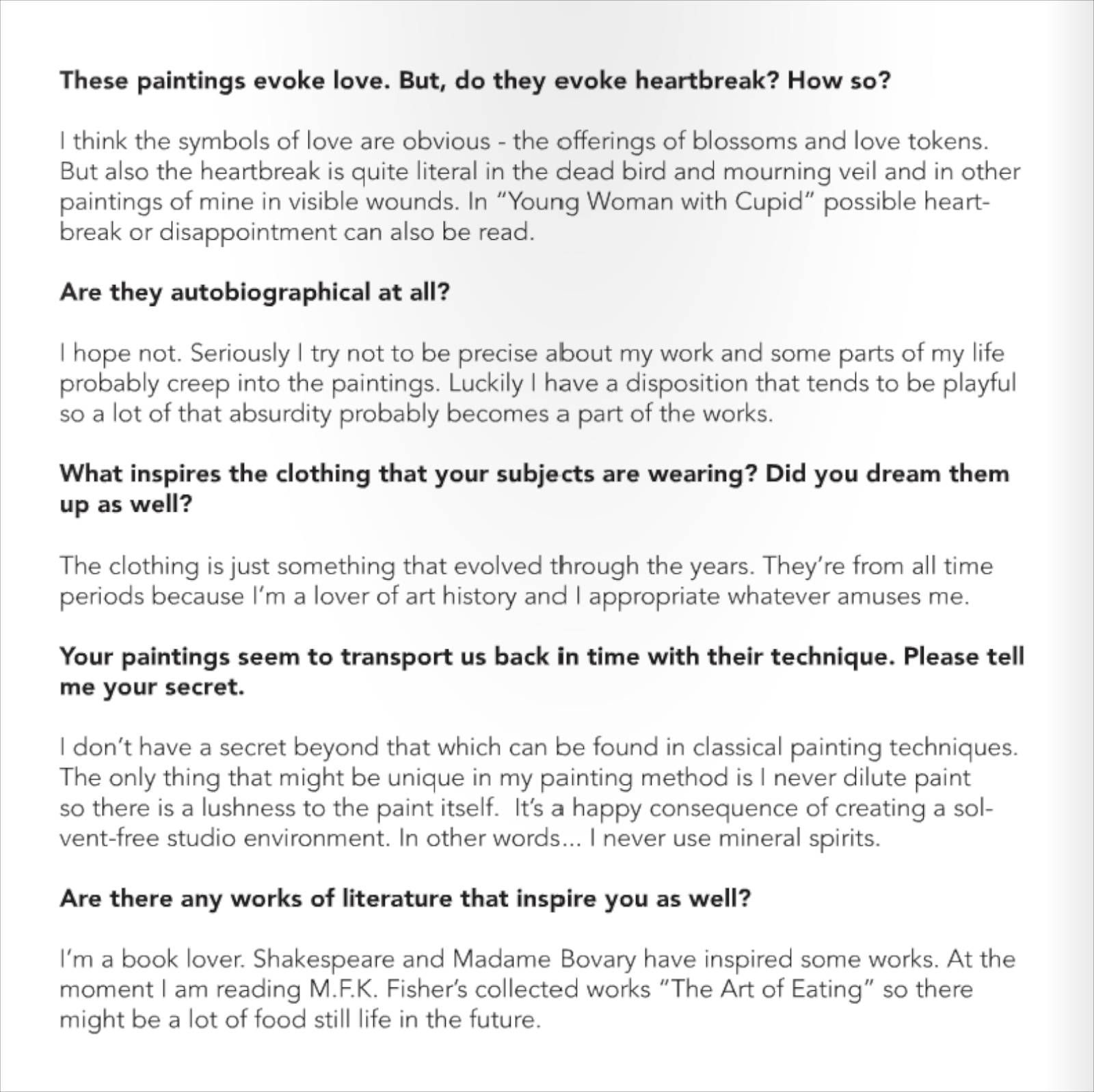 I think the symbols of love are obvious – the offerings of blossoms and love tokens. But also the heartbreak is quite literal in the dead bird and mourning veil and in other paintings of mine in visible wounds. In “Young Woman with Cupid” possible heartbreak or disappointment can also be read.