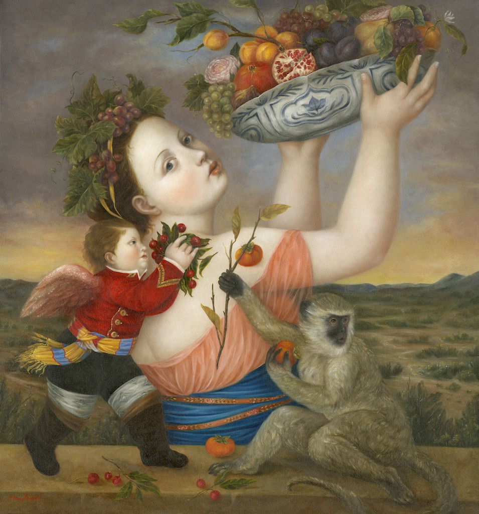 “Feast with Cupid and Vervet Monkey” 32×30 inches, oil on canvas is now available at the Meyer Gallery in Santa Fe. The main inspiration came from a painting by Giovanni Bellini and Titian “Feast of the Gods”.