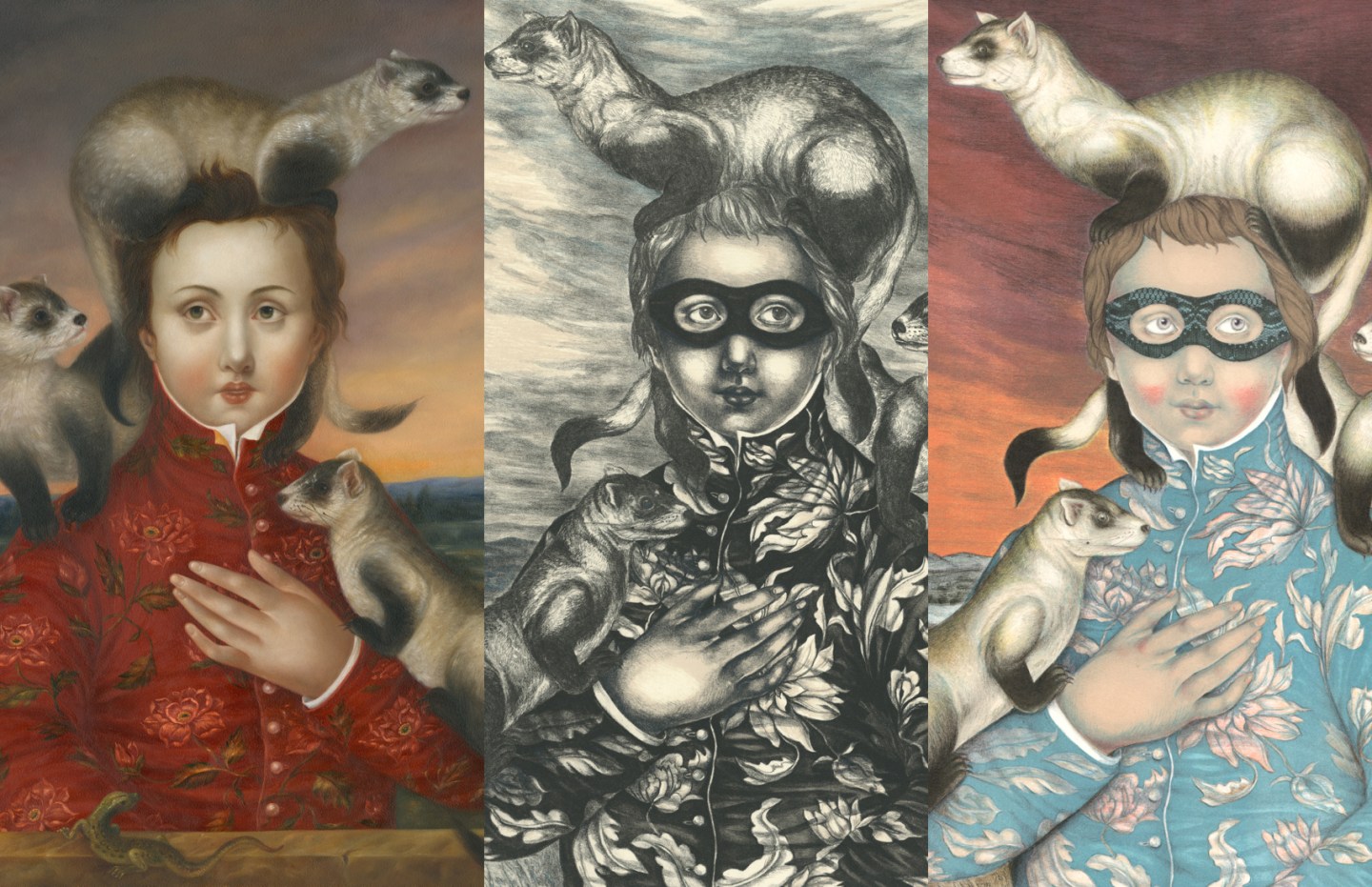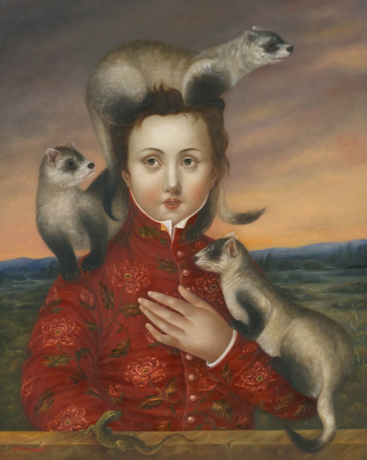 Unusually, I created the oil painting “The Watchers” after working on the print. I felt a deep connection to the subject matter and wanted to keep exploring it. The idea was born from my interest with 19th Century naturalist art and illustrations. In these works by artists such as Audubon, I found a fascination with the artist’s impetus to discover, catalog and illustrate the flora and fauna of the natural world. In the present time, with so many animals and plants becoming endangered and extinct, the desire is to preserve and protect. The black-footed ferrets in “The Watchers” have a precarious story. They were once thought to have become extinct in the 1970s. Miraculously, a tiny population was rediscovered in Wyoming after a rancher’s dog brought home a dead ferret. Through conservation efforts there are now about 700 black-footed ferrets. Their story is an inspiring tale of tenacity and hope, for in this case a species was rediscovered from extinction. In “The Watchers” the figure and ferrets are on their watch, ever vigilant for unknown dangers and glimmers of opportunity.