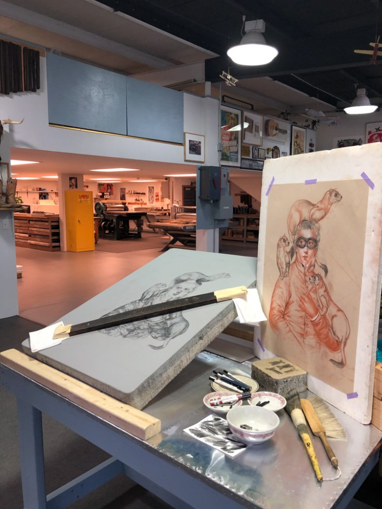 I never thought that a lockdown could have its advantages. In this case, it gave us time and opportunity to explore a side of lithography we never had the chance to do before. After completion of the small monochromatic edition of Fatima’s “The Watchers”, we began to ponder an approach to a color version and since Fatima’s painting style echoes the neo-classicism of a hundred plus years ago we reasoned a similar lithographic rendition would be appropriate. Jack (Lemon) has long been a fan of the Jules Cheret lithographs of 19th century Paris and suggested we follow a similar manner of working. The result is a 14 color lithograph not only in homage to old Jules but printed on the same kind of machine that would have been [in] use back then, our c. 1870 Marinoni Voirin Press. I feel the resulting print was a huge success with overlays and a saturation seldom seen in contemporary prints. It’s really a print to let the eye linger on.