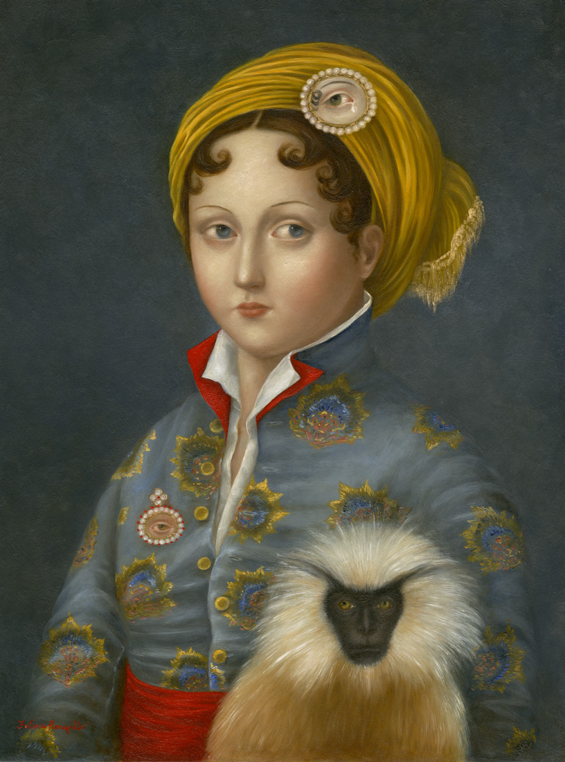 The surreal aspect of an isolated eye attracts me tremendously—the idea of physical dismemberment which is symbolic of a removal or estrangement of a loved one. For anyone who’s ever been in love or had a crush on someone, the photograph of the beloved is treasured. So these are portable remembrances before the camera so to speak. It also reminds me of the mexican ‘milagros’ – little charms of different body parts used to aid in praying for the healing of broken arms or hearts, or even eyes.Compositionally speaking, the framed ornamental eye gives context and a reason for a floating third or fourth eye in a painting. It’s a device of conceit: a portrait within a portrait. For me, it’s an iconic symbol about the figure represented not unlike the reliquaries of saints in old devotional images. The lover’s eye first appeared in my work in 2008 and it continues to be a subject full of mystery and delight.