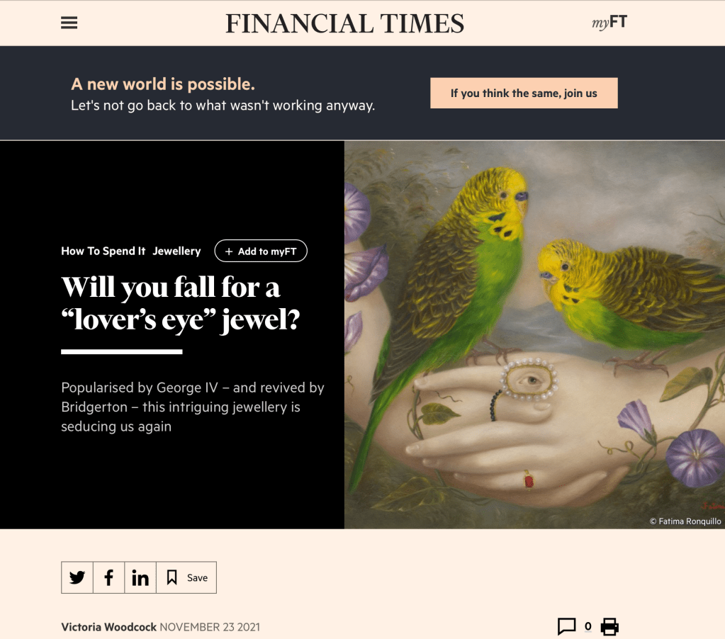 My painting “Together” was featured on The Financial Times in the “How To Spend It” column by Victoria Woodcock on November 23, 2021. Will you fall for a ‘lover’s eye’ jewel? illuminates the revival of interest in the lover’s eye jewelry. It is a fascinating read on the history of the jewels, their newfound popularity and how to buy the real thing. Elle Shushan, a Philadelphia dealer of lover’s eyes and editor of the new book Lover’s EYES: Eye Miniatures from the Skier Collection gives her expertise as well as background on the Skier Collection of the jewels.