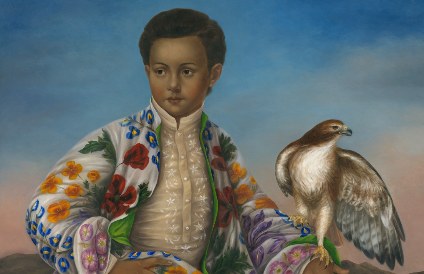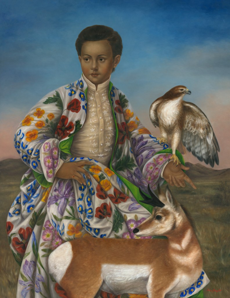 The exhibition’s namesake piece, Borderlands, is a 41” x 32” oil painting depicting a classical figure in an elaborate floral coat, flanked by a pronghorn and red tail hawk. The embroidered flowers on the figure’s garment are native to the Trans-Pecos region of West Texas, which borders New Mexico. The figure also wears a Philippine “barong tagalog” shirt. The symbolism references Ronquillo’s past and present homes; born in the Philippines, she emigrated as a child to the United States in 1987 where her family settled in San Antonio, Texas. Now, Santa Fe has been her chosen home for over a decade. Ronquillo recently returned to Texas on an influential trip to Marfa, which was pivotal to her inspiration for the exhibition. Her work continues to draw connections between myth, art history, literature and folklore, but is layered with references to more local or personal environments, particularly Texas and New Mexico. “They represent that liminal space between myth and reality,” she says of the paintings.