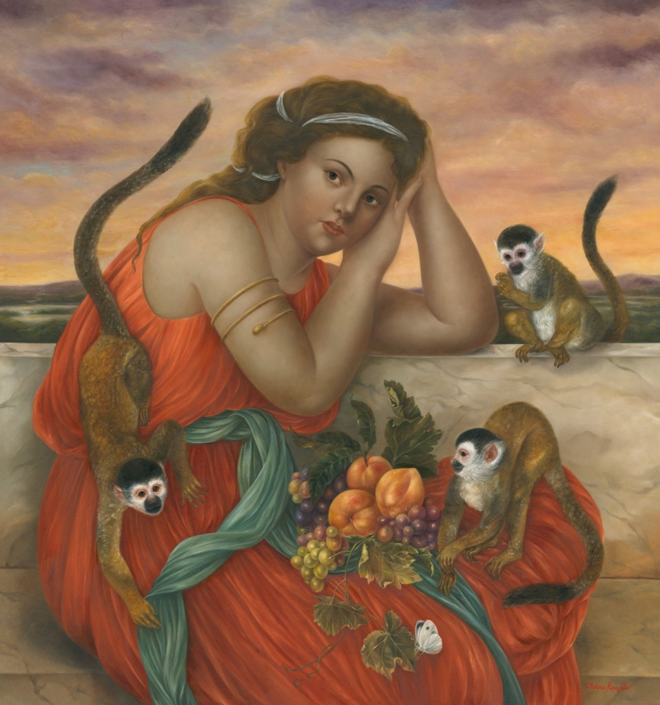 While working on the theme of the borderlands, which for me are the personal “in-between” moments, I also wanted to explore the changing of light, from day into night, from the blue hour to the golden hour or the gloaming. I also thought of the passage of time, how endangered species are here and then may not be in future, which is the case for the golden-cheeked warbler which is endemic to Central Texas and also for the Central American squirrel monkey which has been a recurring figure in many of my paintings over the years. The Palawan pheasant peacock in “The Blue Hour” is another such endangered species and is a reference to my Philippine roots.