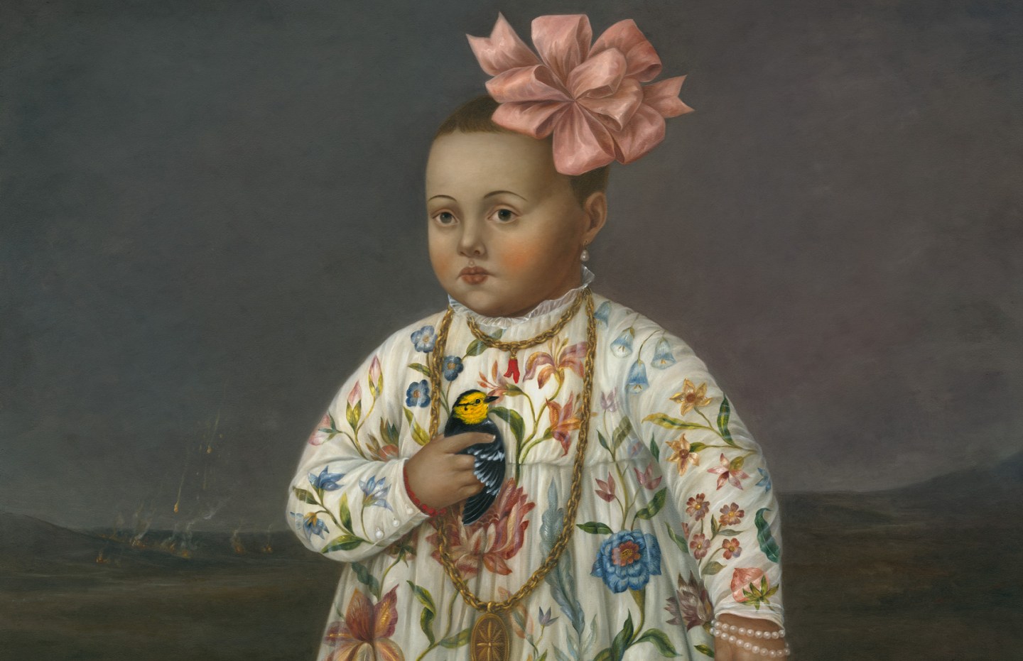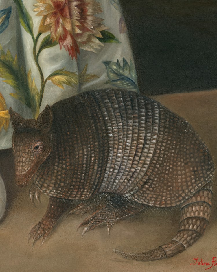 The painting “Child with Armadillo and Golden-cheeked Warbler” was directly inspired by the poem “The Armadillo” by Elizabeth Bishop. In the poem, the fire lanterns or balloons, often sent up in the night skies in celebration, can sometimes go horribly wrong and something so beautiful can wreak destruction. This year had been a year full of devastating wildfires, especially for New Mexico.