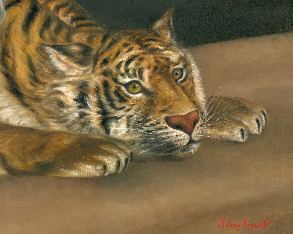 As 2022 draws to a close, I am so happy to present “Winged Victory Riding a Tiger”. I have been working on this piece on and off for most of the year, this being the Year of the Tiger after all. The idea began nearly three years ago, when I became fascinated by Eugéne Delacroix’ lithograph “Royal Tiger”. I was researching beautiful examples of printmaking as I was then embarking on my very first lithograph. Delacroix is a painter that I have long admired. His colors are ravishing and the dramatic compositions are operatic. What I really love are his sketches and watercolors, especially those from his travels in North Africa, and of course the tigers. It’s charming to read that he studied big cats at the Paris zoo prior to creating this lithograph. I too observed the tigers at the San Diego Zoo Safari Park as a preliminary for this painting, the one I particularly liked was named Diana. The figure of Victory perching on the tiger’s back is a nod to ancient Greek mosaics depicting Dionysus sometimes accompanied by the figure of winged Victory (Nike) on a chariot drawn by tigers. It is also a reference to an older painting of mine, “Baby Dionysus Riding a Cheetah”. The body of work I created for 2022 concentrates on the theme of “Borderlands” – that liminal space between light and dark, beauty and danger. “Winged Victory Riding a Tiger” was curiously central to that whole narrative and inspired all the other paintings created this year.