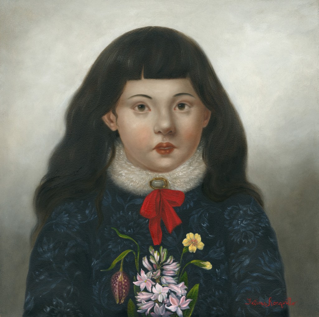 These two paintings with the background of flames are a reference to Elizabethan miniature paintings by Nicholas Hilliard and Isaac Oliver. The flames were representative of passionate love or religious devotion, and the poetic imagery has always attracted me in the way it evokes mystery and courtly love.