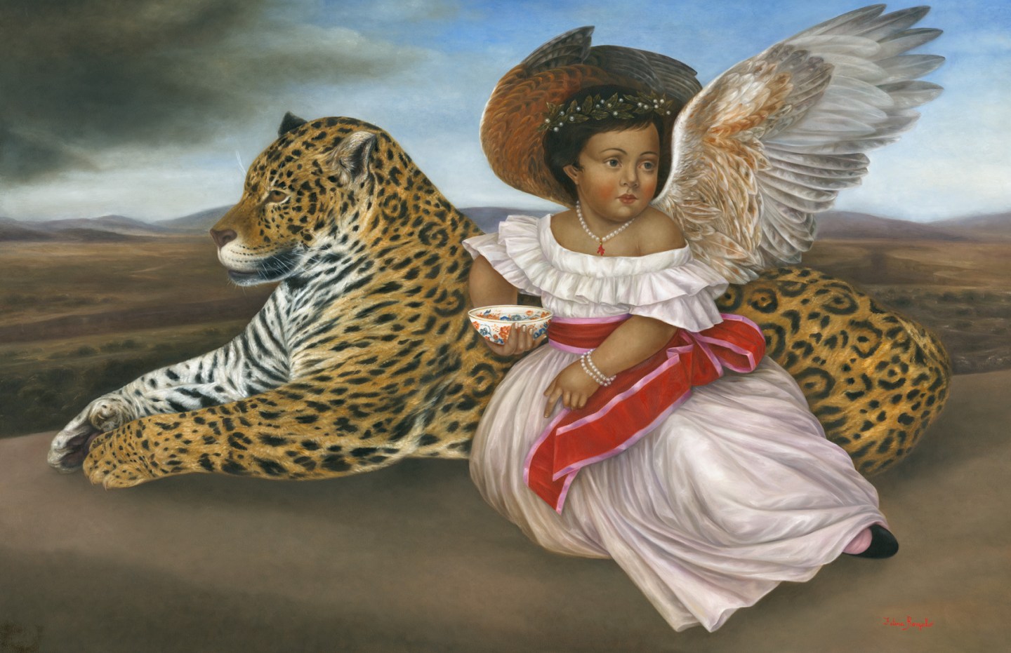 The centerpiece painting, “Journey’s End: Winged Victory and Jaguar at Rest” is representative of the themes I have been exploring: that which center on our relationships with the natural world and the amalgamation of my personal experiences and influences―Filipino, American, New Mexican, old world and new. There used to be jaguars in the American Southwest, a fact that I only recently found out. Their extirpation from the U.S.is a sad loss. The girl recalling my Philippine heritage is Nike, or Winged Victory, she faces away from the viewer, in a wistful attitude perhaps in remembrance of lives lived and places discovered. The landscape is evocative of northern New Mexico, with monsoon clouds looming, but there is also a clearing in the sky, full of promises.
